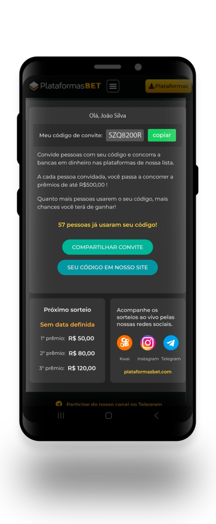Ao se cadastrar no Plataformas Bet, você receberá um código exclusivo para convidar pessoas e concorrer de forma automática a prêmios de até R$500,00 em banca. Quanto mais pessoas usarem o seu código de convite, mais chances você terá de ganhar. Acesse o Menu > Entrar >Cadastre-se e faça o seu cadastro!